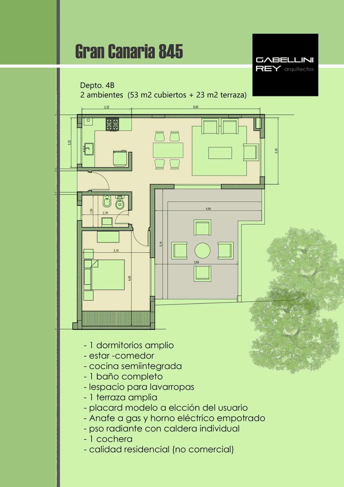 Con una superficie total de 76 m² (53 m² cubiertos + 23 m² de terraza propia), la unidad combina diseño, confort y calidad constructiva en un entorno residencial.